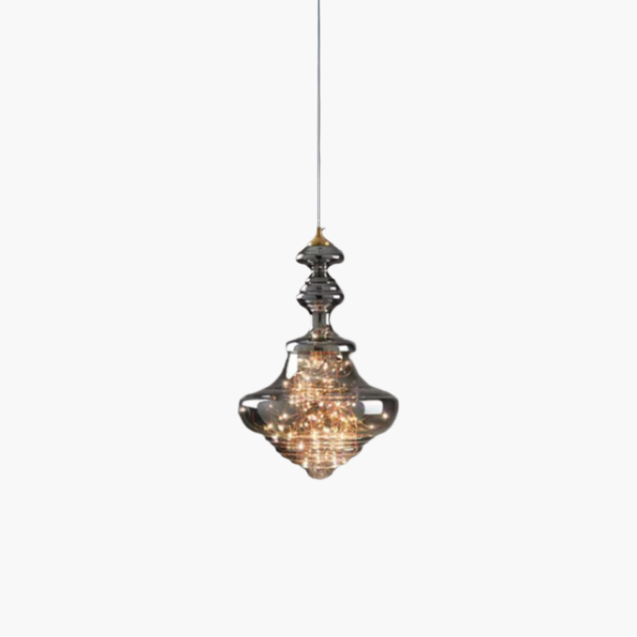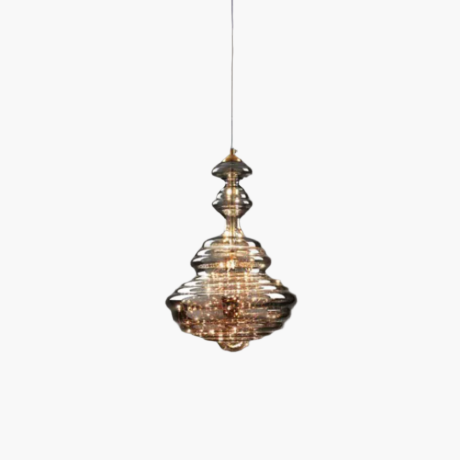 Denne moderne lysekrone er lavet af glas og messing i høj kvalitet. Fem stilarter kan vælges, hver med unik form, så du kan blande og matche eller bruge en alene. Den grå glasskærm er fint struktureret, smuk og holdbar, og afspejler lyskildens skønhed optimalt. Tænd lampen, og lyset brydes i loftet som en stjernehimmel, for en romantisk atmosfære. Lampens kobberhus er udsøgt poleret, med unik glans og holdbarhed. Perfekt til spisebord, bar, køkkenø, soveværelse osv.